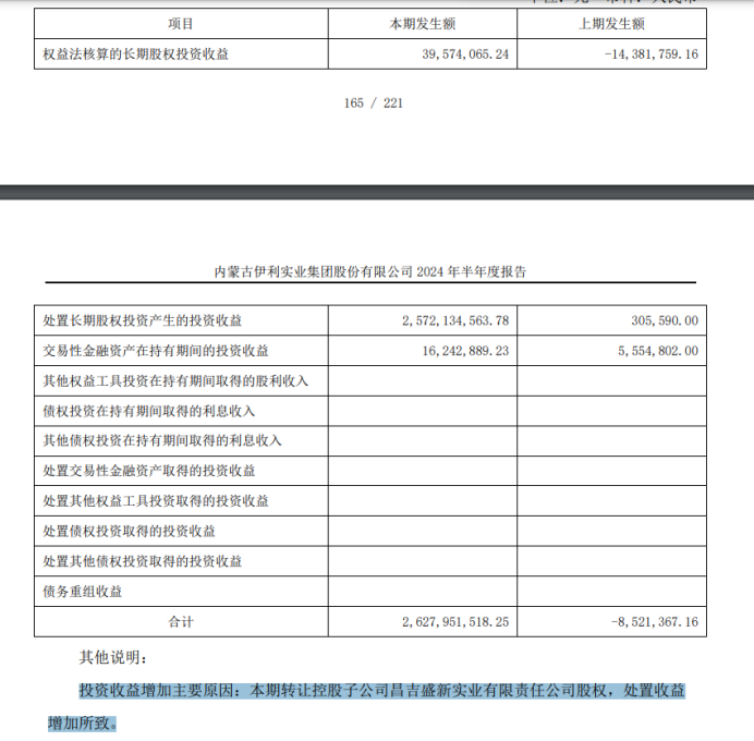 這裏需要指出的是,2024年前三季度的歸母淨利潤之所以能創下新高,並且增速得以大幅回升,主要還是在2024年年初時轉讓了控股子公司昌吉盛新實業有限責任公司股權,當時的交易對價是26.47億元。這部分的收益被伊利股份計入投資收益,相比此前年份,伊利股份的投資收益立馬同比暴漲了7191%。