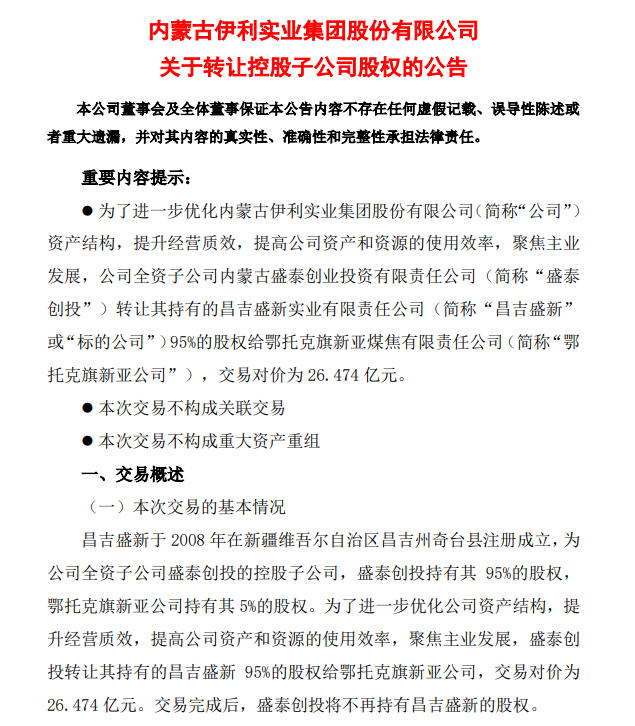 據伊利股份2024年1月5日發佈的公告稱,為了聚焦主業發展,公司全資子公司內蒙古盛泰創投轉讓其持有的昌吉盛新95%的股權給鄂托克旗新亞煤焦有限責任公司,交易對價為 26.474 億元。而據公開信息,昌吉盛新2009年獲得了新疆準東煤田奇台縣黑梭井東勘查區礦產資源勘查許可證,伊利此舉相當於去年初轉讓了探礦權以換取現金迴流。
