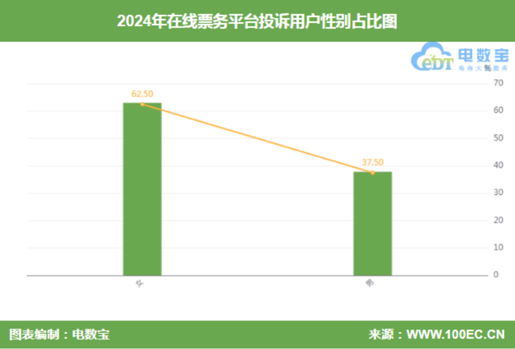 據“電訴寶”顯示,在線票務2024年男性用户投訴比例為62.5%,女性用户投訴比例為37.5%。