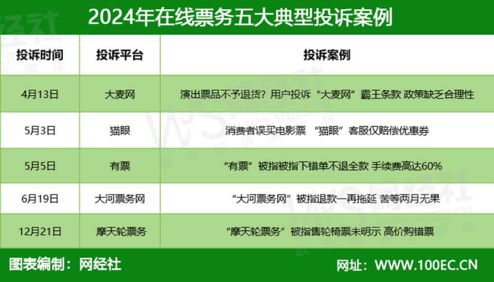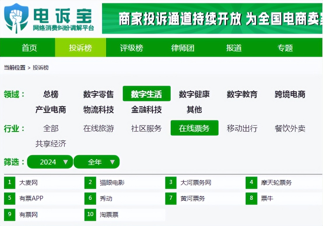根據“電訴寶”2024年受理的在線票務領域用户有效投訴顯示,按投訴量入選投訴榜的依次為:大麥網、貓眼電影、大河票務網、摩天輪票務、有票APP、秀動、黃河票務、票牛、有票網、淘票票。