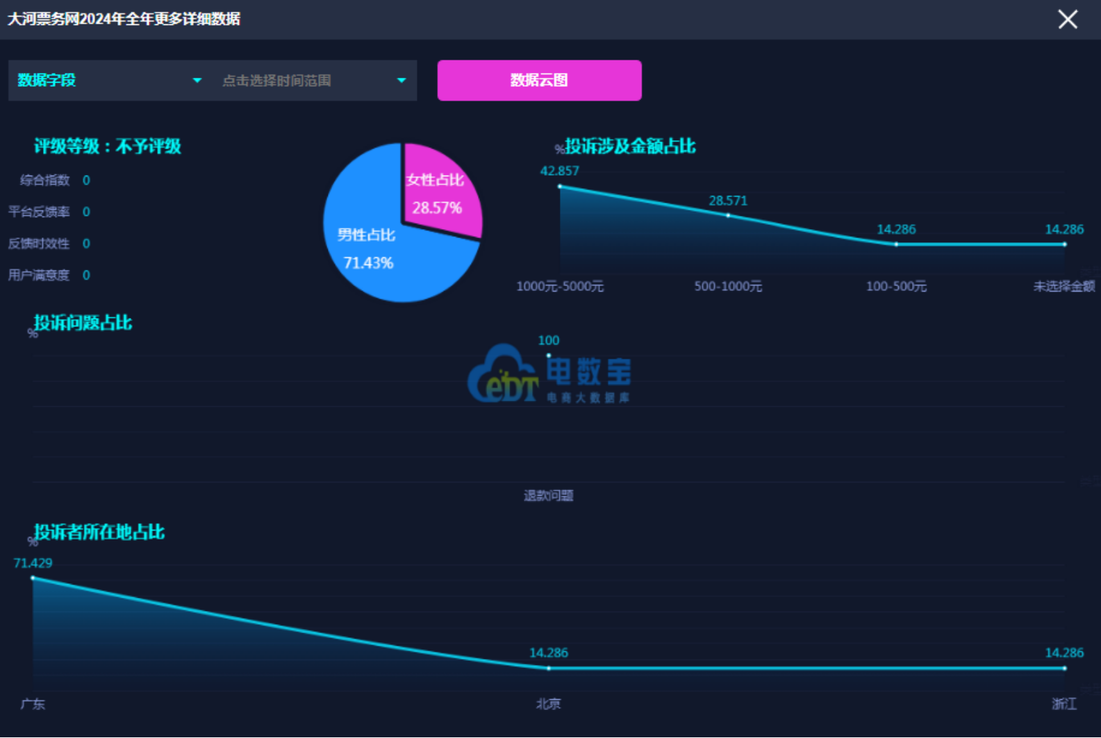 2024年,“大河票務網”涉嫌存在退款問題等問題;用户投訴“大河票務網”的消費金額主要在1000-5000元、500-1000元、100-500元、未選擇金額區間。