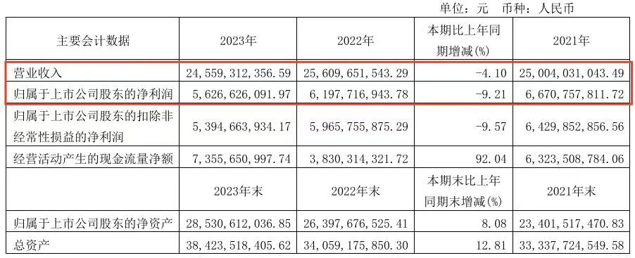 而2023年海天味業的形勢並未有所改觀。財報顯示,海天味業全年營業收入為245.59億元,同比下降4.1%;歸屬於上市公司股東的淨利潤也進一步下滑至56.27億元,較上一年度減少了9.21%。值得注意的是,這是海天味業十年來首次同時出現年度營業收入、淨利潤雙下滑的情況。