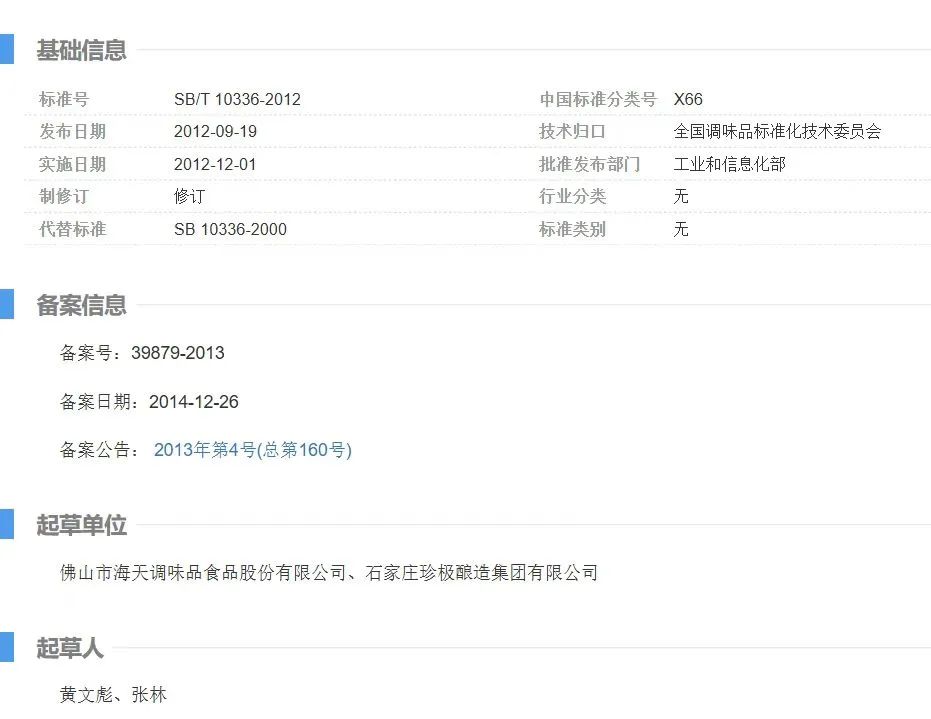 值得注意的是,海天味業宣稱產品符合國家標準,但據全國標準信息公告服務平台檢索結果顯示,佛山市海天調味食品股份有限公司是配製醬油行業標準的起草人之一。