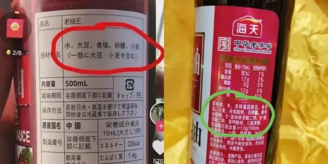 有短視頻博主稱,海天味業在國內售賣的醬油含有多種食品添加劑,包括已被列為一級致癌物的苯甲酸鈉,而在國外售賣卻是零添加,只有水、大豆、小麥、食鹽等,其產品存在雙標。