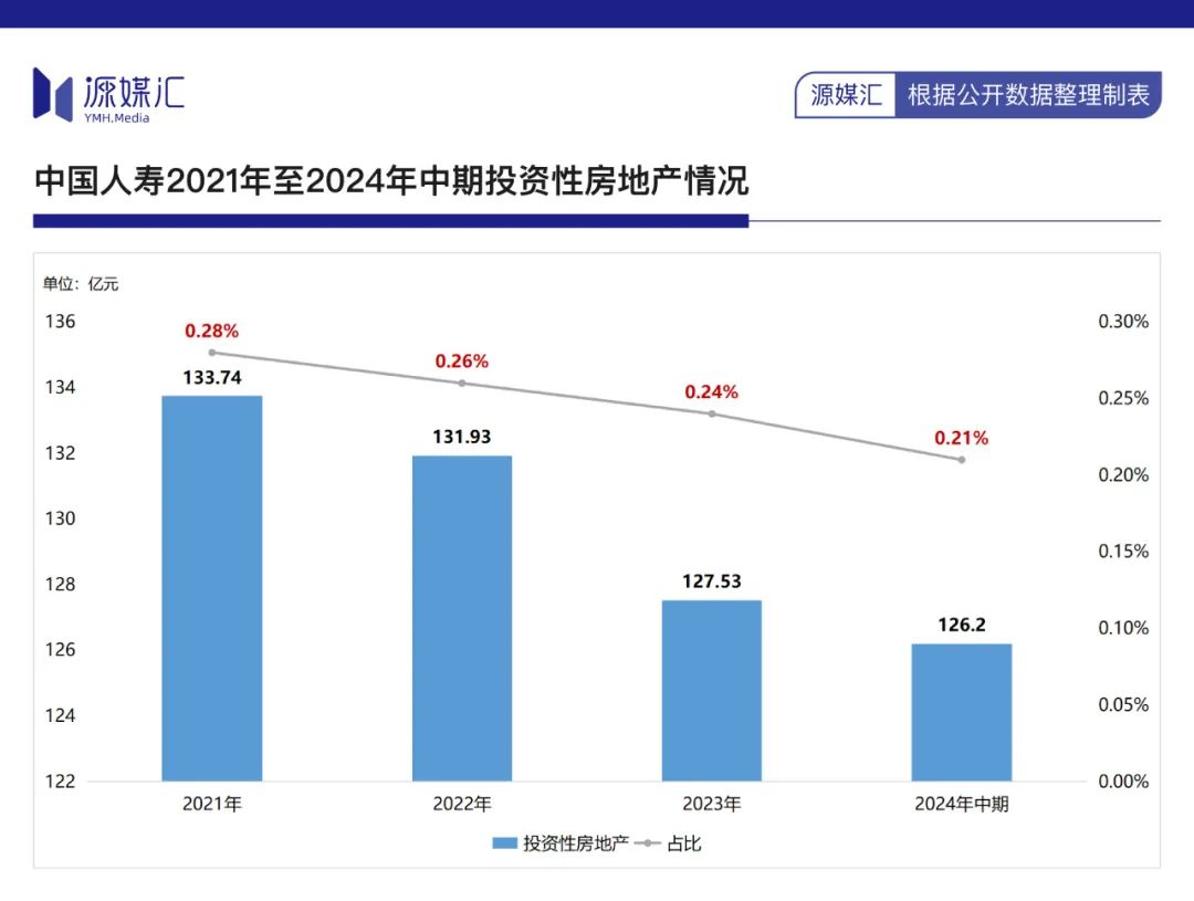 相比2021年,中國人壽目前投資性房地產規模雖然呈向下趨勢,但尚未出現大幅度下滑,2024年中期為126.2億元,佔比為0.21%。