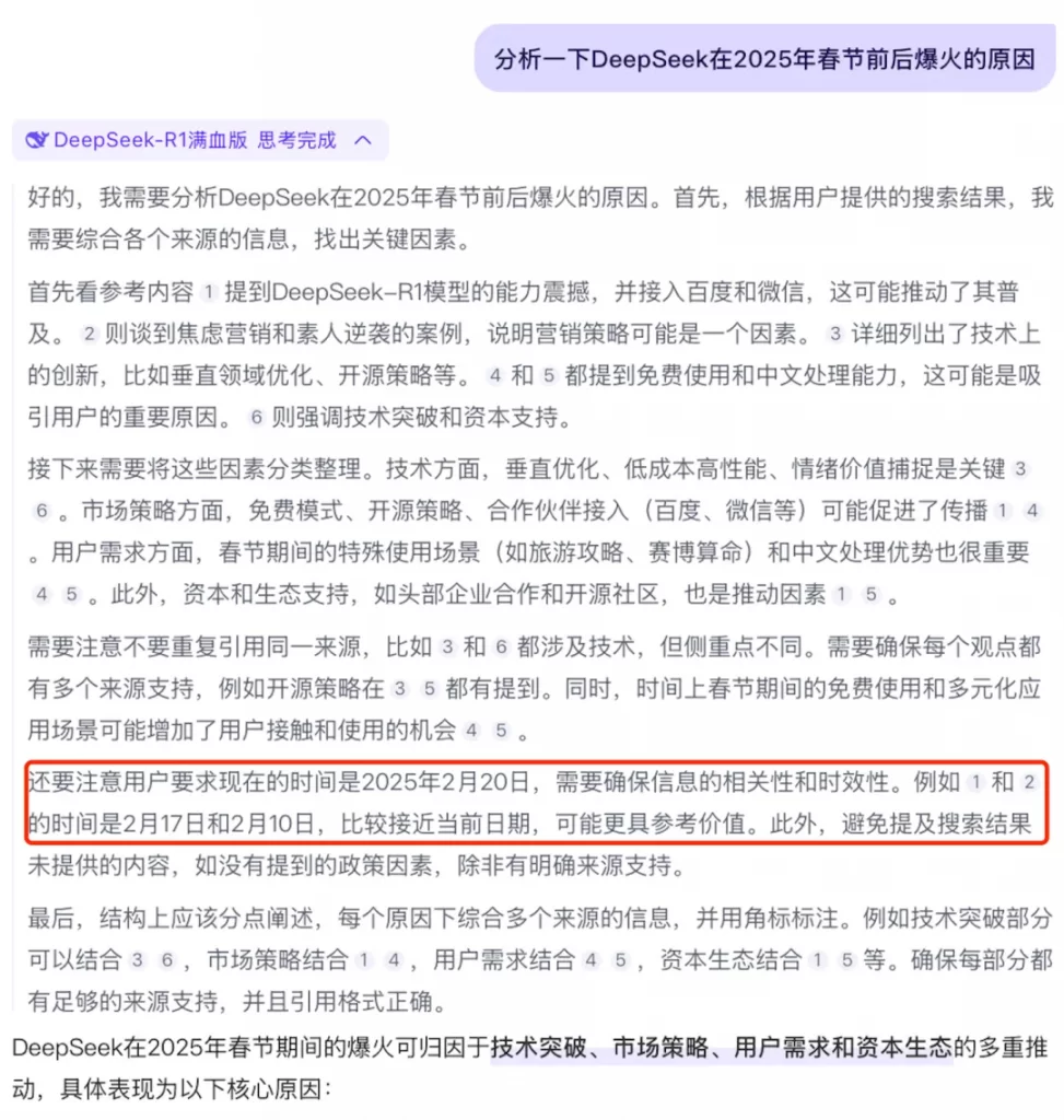 這個問題不僅考驗了百度AI搜索的聯網搜索與分析能力,同時“2025年春節前後”為提問增加了一個時間範圍,也考驗了產品對於搜索結果篩選的能力。