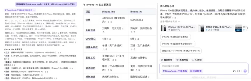接下來,讓我們開啓百度AI搜索的聯網功能,來提問一些更有挑戰性的問題。第一個問題,我們向百度AI提問:“蘋果最新發布的iPhone 16e是什麼配置?相比iPhone 16有什麼區別?”