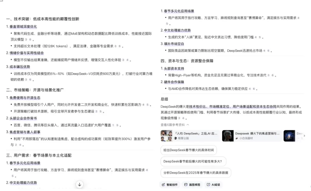 而從生成結果來看,百度AI搜索從技術突破、市場策略、用户需求、資本與生態四個維度進行了闡述,不僅指出了DeepSeek的火爆不僅有技術的突破,還有“春節場景”與“行業降本需求”等方面的天時地利人和。