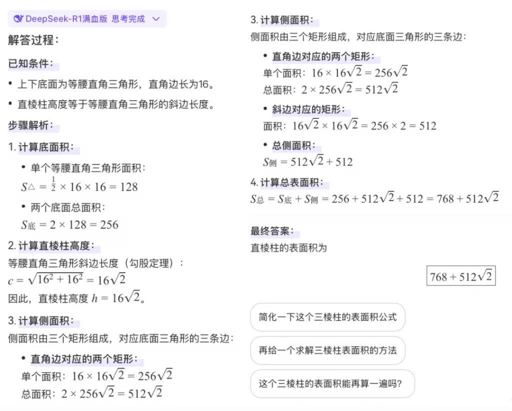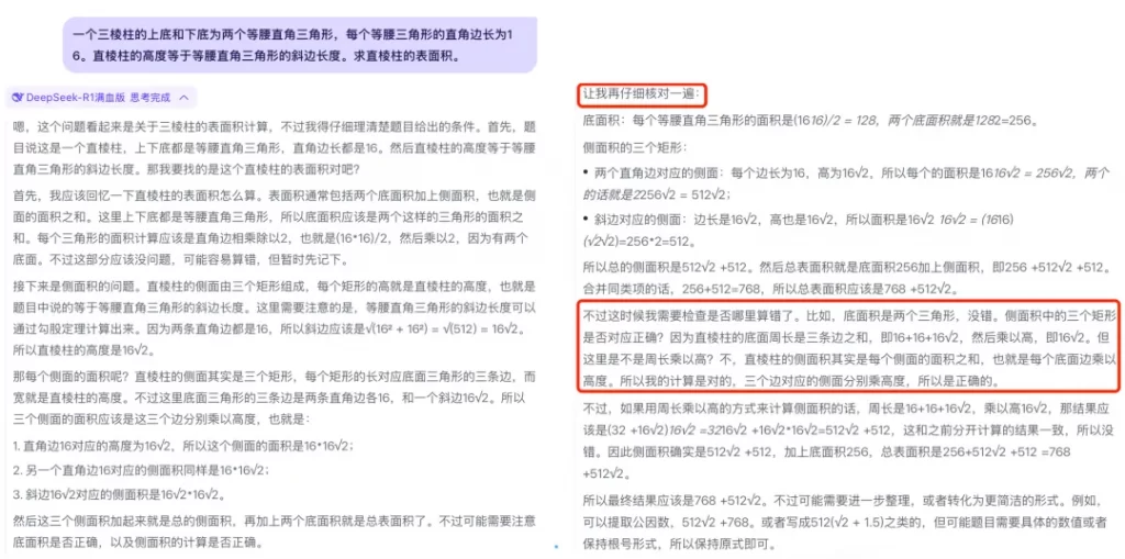 從思考過程來看,百度AI搜索不僅可以給出詳細的解題過程,同時還會有檢查校對的過程,這是很多“殘血版”R1模型所不具備的,可以看出百度AI搜索確實底層採用了“滿血版”的DeepSeek-R1模型。