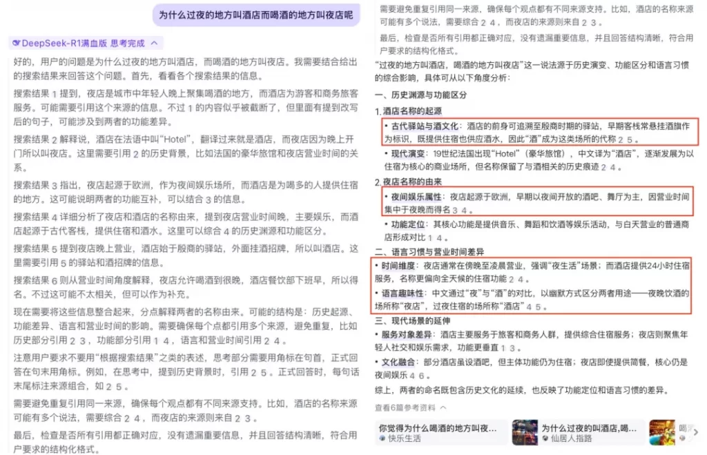 而另一項測試,大模型之家則採用經典的弱智吧問題:“為什麼過夜的地方叫酒店,而喝酒的地方叫夜店?”