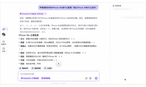 接下來,讓我們開啓百度AI搜索的聯網功能,來提問一些更有挑戰性的問題。第一個問題,我們向百度AI提問:“蘋果最新發布的iPhone 16e是什麼配置?相比iPhone 16有什麼區別?”