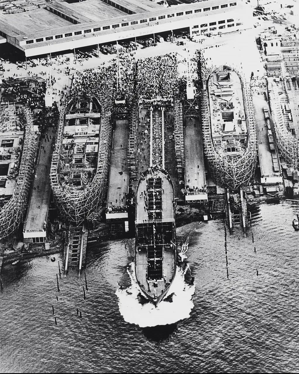 在二戰及戰後的巔峯期,各大造船廠如同下餃子一樣。**直到50年前的1975年,美國造船業還是響噹噹的世界第一。**那時的中國,造船量恐怕都趕不上美國的零頭。