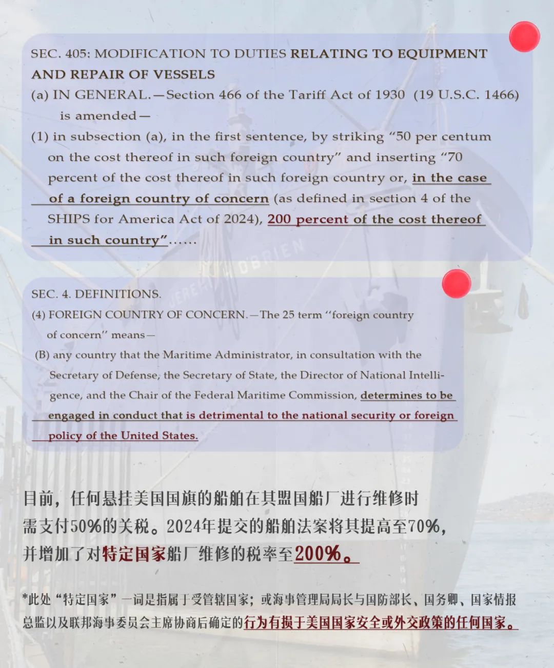 為了扶持本國造船業,去年12月,兩黨下了一劑猛藥,在國會推出**《美國船舶法案》,提議對在“受關注國家”(就是中國)**船廠維修的、懸掛美國船旗的船隻,徵收200%關税。