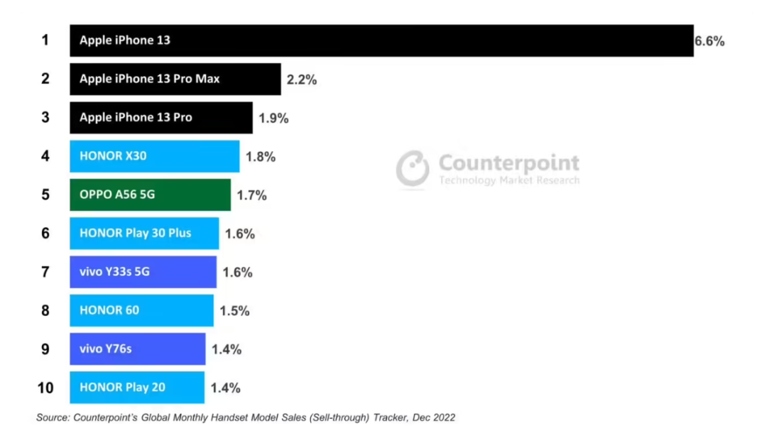 蘋果在2022年推出的第三代iPhone SE系列產品也是如此。根據Counterpoint Research發佈的數據,就2022 年中國市場銷量而言,iPhone 13是最暢銷的智能手機機型,貢獻了6.6%的市場份額,隨後是iPhone13和iPhone Pro Max,第三代iPhone SE系列產品都排不進前十。