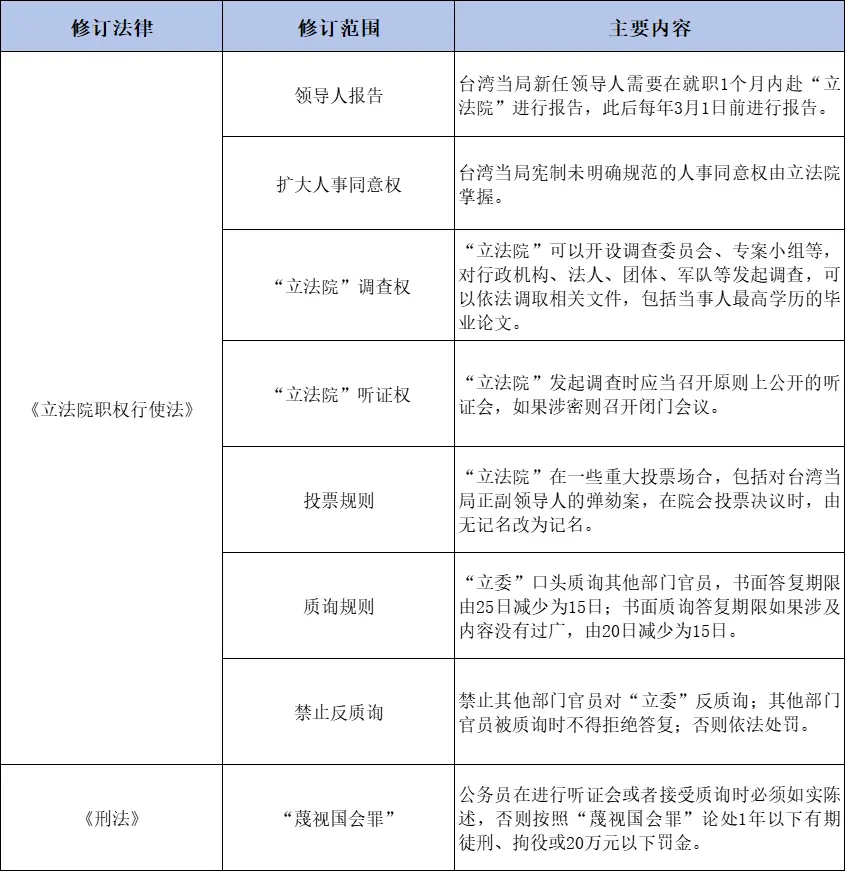 台灣當局“立法院”職權修法,指2024年4月以來國民黨和民眾黨黨團提出的一系列法案,目的是擴大“立法院”的職權。包括增訂“《立法院職權行使法》”,規定台灣當局領導人需要每年3月1日前赴“立法院”報告、擴大人事同意權、增加“立法院”在彈劾台灣當局正副領導人時的聽證和調查權等;增訂“《刑法》”,增加所謂“蔑視國會罪”。具體內容如下表格: