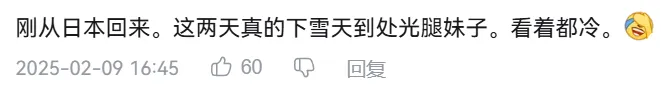 “今後天好冷啊,看到放學女高中生的腿我感覺她們好冷,我現在已經穿上高筒襪了,她們卻還在穿短筒襪看着就冷……前幾天聽説有的學校有一條嚴格的校規,禁止穿打底褲,是瘋了嗎?”