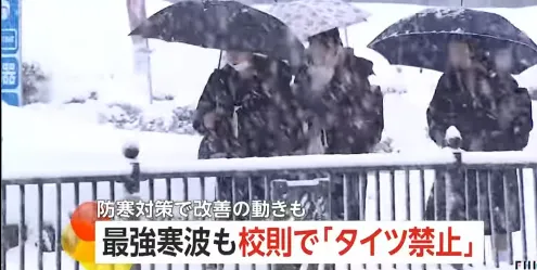 今年冬天,日本迎來了最強寒潮,各地可謂“雪花飄飄~北風蕭蕭~”。就是這麼冷的天氣,有一些學校卻不讓女學生穿打底褲之類的保暖衣物。