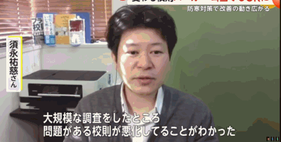 社會活動人士須永先生對於這種校規存在質疑,在詢問調查了4000名學生家長後,得出的結論:很多學生和家長明明已經和學校反應校服很冷了,但學校就是因為“這樣穿太時髦了”而無視了學生家長們的請求,非常的苛刻不人性化。須勇先生將這寫問題校規進行整理,並收集了6萬人的簽名,將這份資料上交給了文科省(類似於教育部),雖然在那之後文科省也發出了積極整改通知,但是目前各個學校還只處於接到通知的階段,很多學校還沒有對校規進行實際的更改。