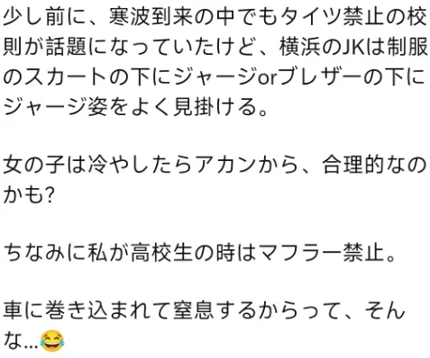 “不久之前,寒潮到來的時候,很多學校規定禁止穿打底褲的話題火爆起來了,但我在橫濱經常能看到女高中生制服裙子裏面穿着運動褲,或者在西裝外套裏面穿運動衫,順帶一提我高中的時候禁止戴圍巾,原因居然是因為怕捲進車裏引發窒息。”