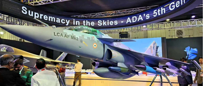 印度在航展上展出的“光輝Mk2”戰鬥機模型。“光輝”戰鬥機從開始研製到列裝,花了近40年的時間,技術難度更高的AMCA是否能按時完成,外界普遍持質疑的態度。圖源:澎湃新聞