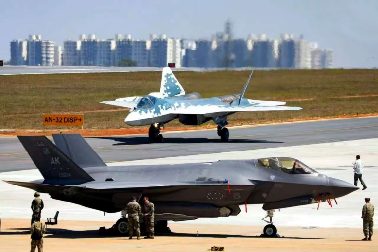 俄羅斯蘇-57隱身戰鬥機和美國F-35隱身戰鬥機首次同台競技。圖源:澎湃新聞