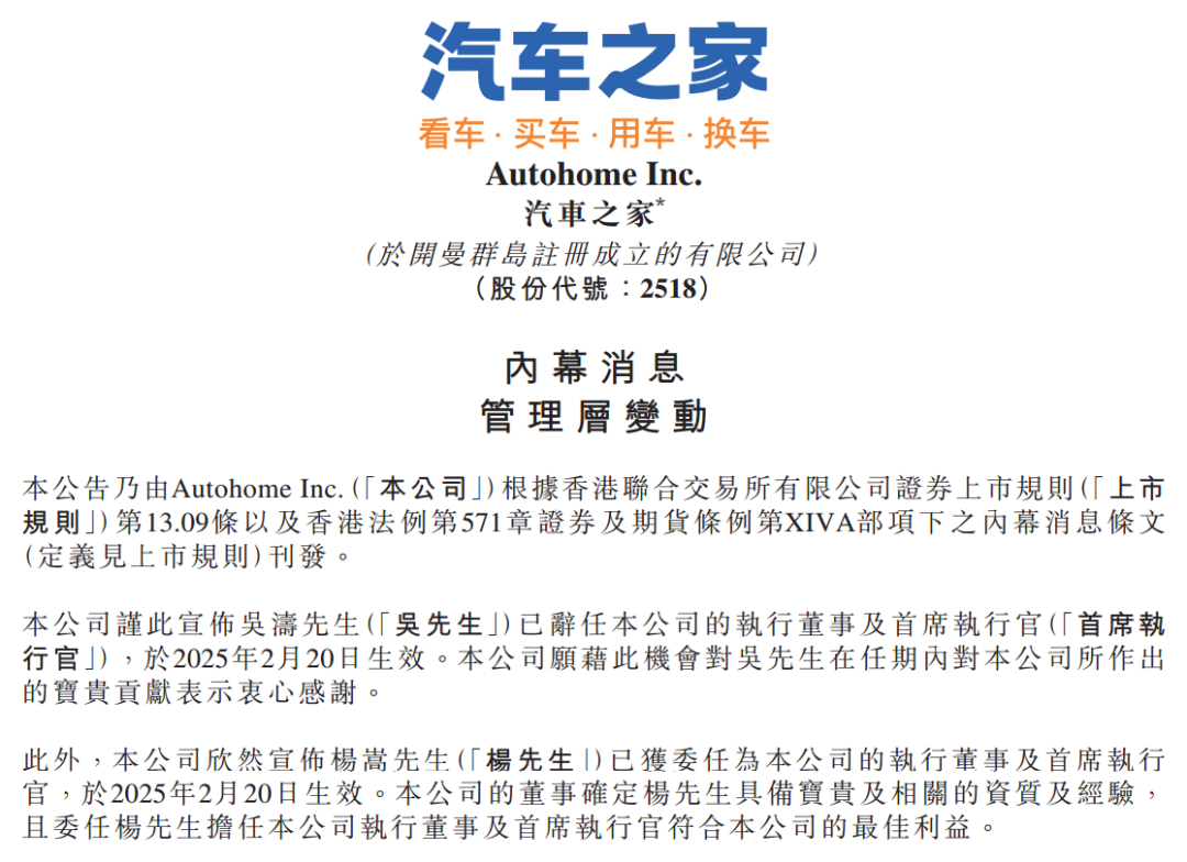 2月20日,汽車之家公告稱,吳濤已辭任公司執行董事及首席執行官,楊嵩被任命為公司執行董事及首席執行官,自2月20日起生效。