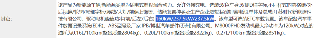 這一點我在工信部的新車名單裏找到了印證,可以看到,尊界 S800 其中一個增程車型確實用上了前一後二的三電機佈局,峯值功率分別是 160 、 237.5 和 237.5 千瓦。
