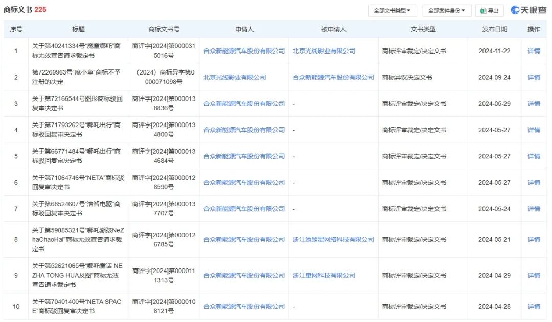 天眼查顯示,哪吒汽車即合眾新能源汽車股份有限公司曾申請光線傳媒旗下北京光線影業有限公司“魔童哪吒”商標無效。