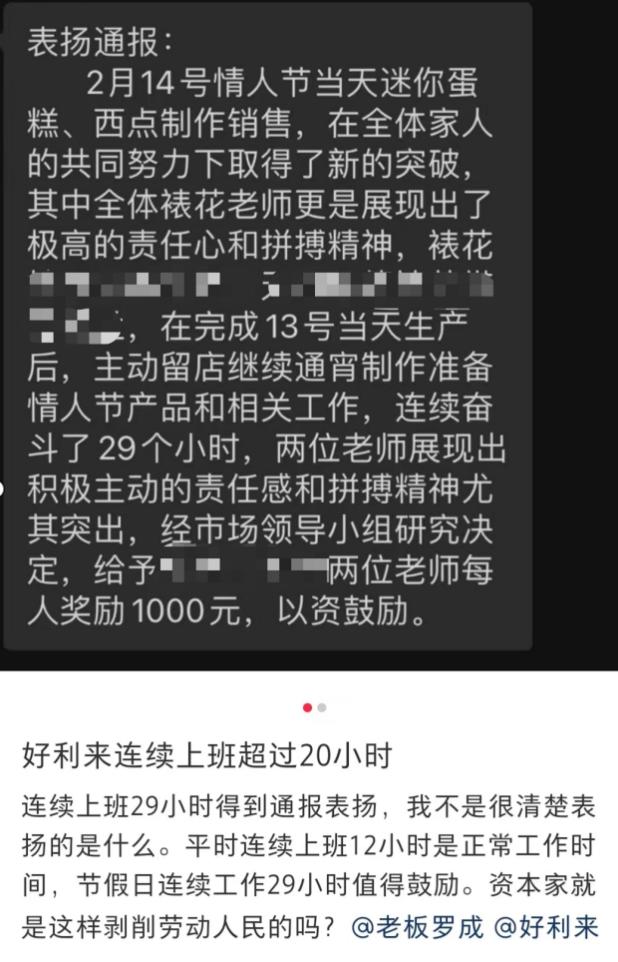 而讓網友深感不悦的原因,正是近期好利來四川成都一門店發佈的一則表揚通報。因為在情人節前夕連續工作了29個小時,好利來的兩名員工每人獲得了1000元的獎勵。
