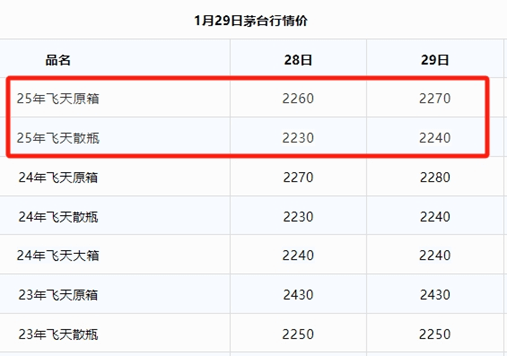 春節後,茅台開始陸續發貨。從市場批價表現可以看到,春節結束後至今,飛天散瓶批價下跌了50元左右。2025年飛天散瓶跌破2200元,而以往年份的老酒則跌價更多。