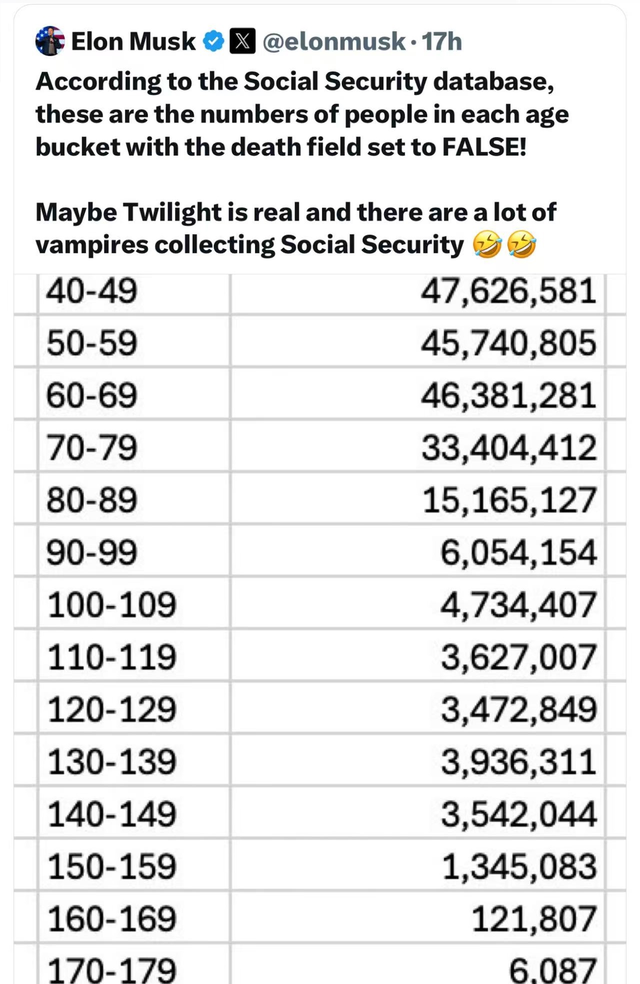 前幾天馬斯克踢館美國社會保障系統,説美國有誕生於清朝康熙年間的“吸血鬼”在領取美國社保。輿論一片譁然。然後社保局出來澄清,説這是IT系統的問題,劇情似乎有了反轉。然而,如同世界上所有的吃瓜大戲,反轉之後,總是再有反轉的,馬斯克又出來狠狠地給社保局一錘子。