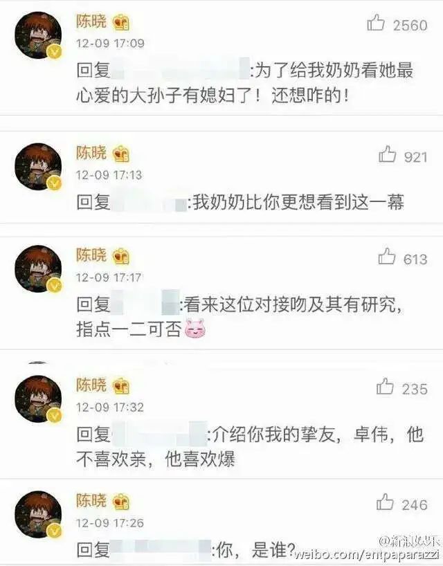 12月,陳曉帶陳妍希回鄉祭祖,在奶奶的墓園裏,兩人躲在樹林甜蜜親吻,被狗仔拍到併產生負面輿情後,陳曉怒懟網友:“我奶奶比你更想看到這一幕,為了給我奶奶看她最心愛的大孫子有媳婦了!”
