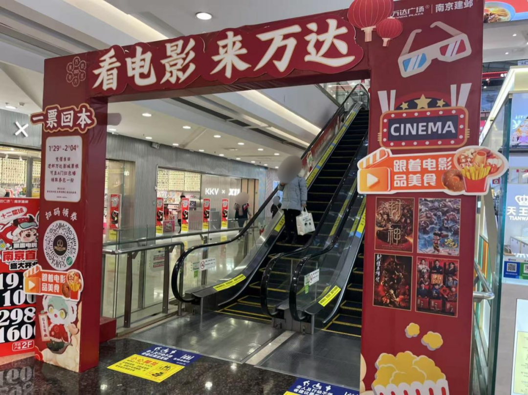 步入南京建鄴萬達廣場,扶梯口架起的“紅包牆”吸引着來來往往的商場顧客駐足。這是商場四樓的萬達影城為了今年春節檔特地製作的活動物料,碩大的活動二維碼指向了萬達影城今年推出的“一票回本”活動——顧客掃碼領取券包,憑藉票根可去往餐飲商鋪享受折扣或者小食品嚐機會。