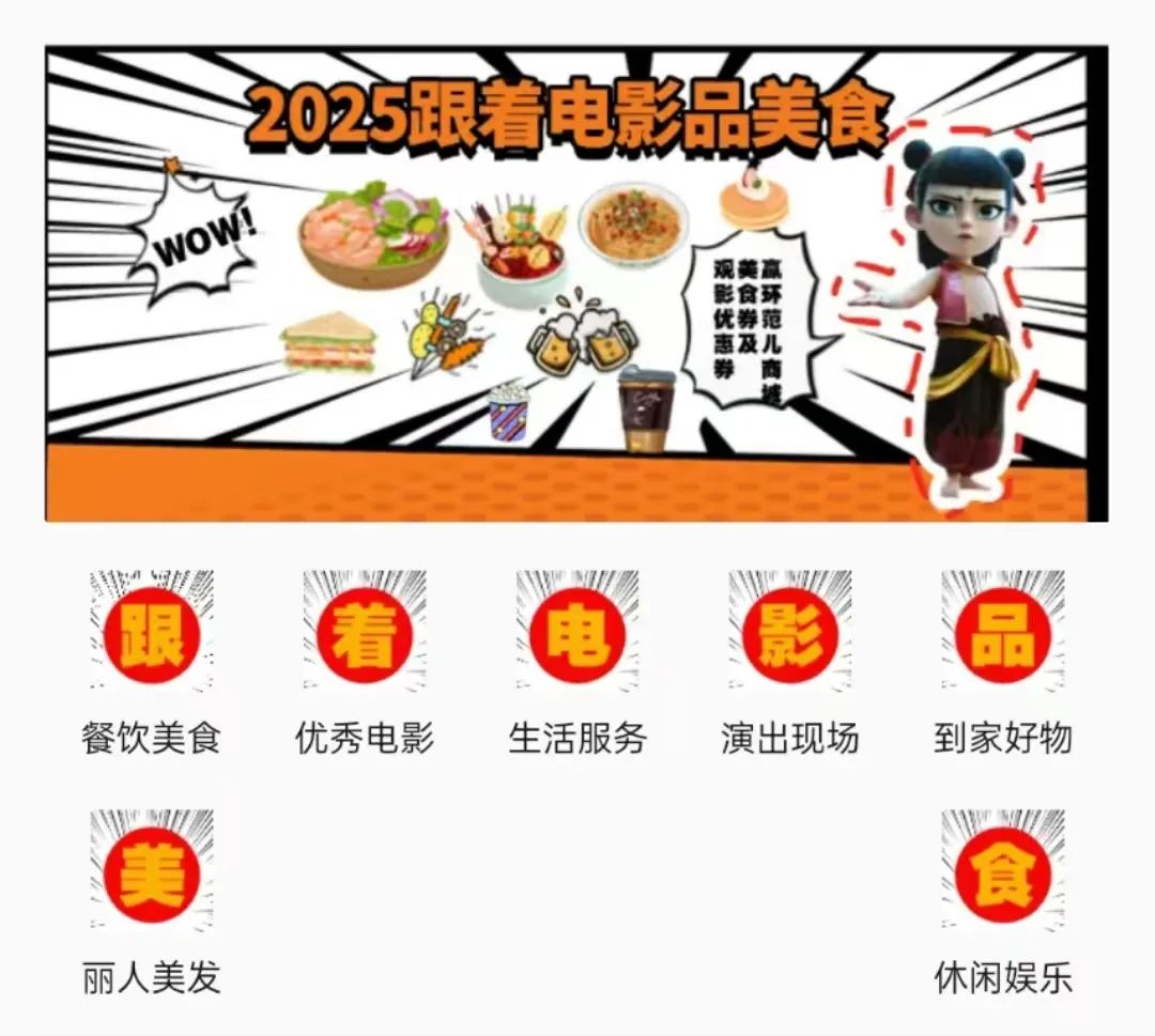 在“環範兒優選”小程序上,影院始終處於核心位置,比如“跟着中環影城悦影繪店品高新區周邊美食”的banner頁,點擊跳轉就可以快速找到影院周邊酒店、美甲店、火鍋店等商鋪,對周邊的商鋪資源進行了最大程度的挖掘。