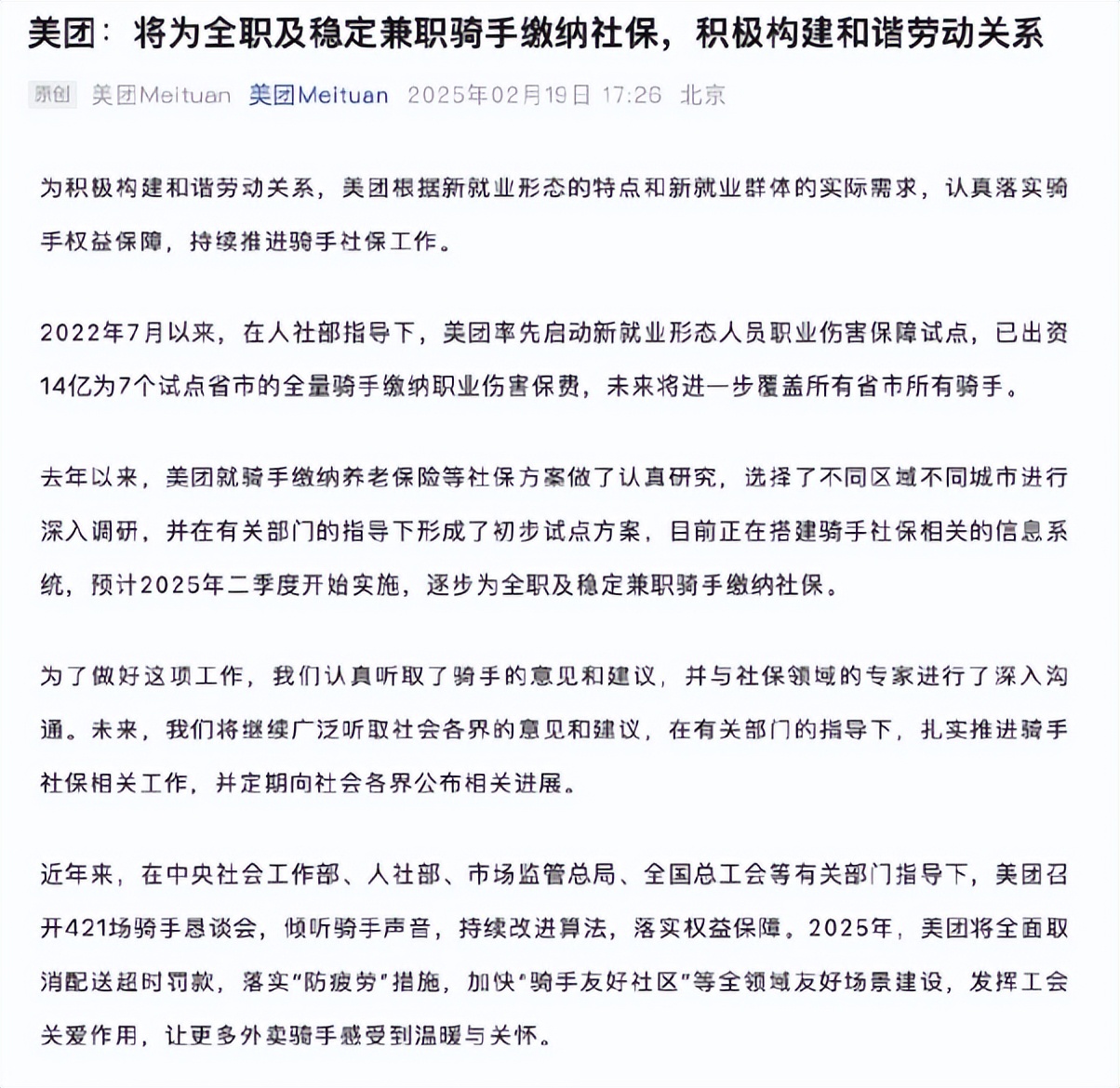 當天下午,美團就跟進了。美團在19號下午5點27分發布公眾號文章表示,預計會在今年第二季度開始實施,逐步為全職及穩定兼職騎手繳納社保。