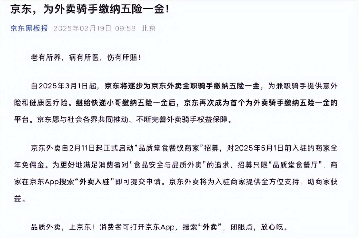 2月19日,外賣行業直接變天了。當天上午10點,京東發佈公眾號文章表示,要從3月1日開始,給全職騎手繳納五險一金,給兼職騎手繳納意外險和健康醫療險。