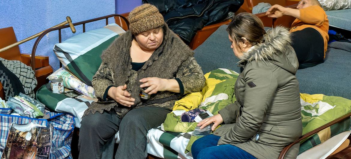 聯合國人道協調廳/Yurii Veres婦女們在烏克蘭的一個戰爭流離失所者中心交談。