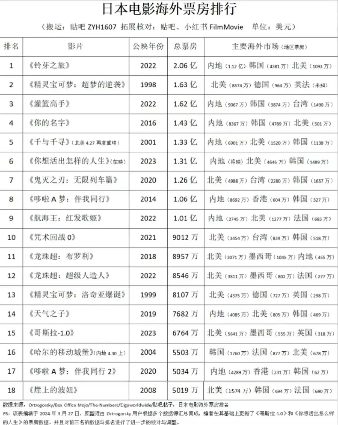 在原創方面,宮崎駿的“收山之作”席捲4683萬美元,打破原來由《借東西的小人阿莉埃蒂》保持的廠牌紀錄(1920萬美元),讓吉卜力在北美破千萬的作品數達到四部。由新海誠執導的《鈴芽之旅》也拿到1093萬美元的成績,正在本土之外追尋宮崎駿的腳步。若加上《精靈寶可夢》劇場版等較早期作品,在北美破千萬的日本動畫已遠超10部。
