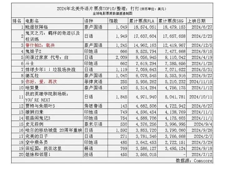 而在2019年及之前,印度電影在北美突破千萬美元便已漸成趨勢,包括《巴霍巴利王2:終結》(2019萬美元)、《摔跤吧!爸爸》(1239萬美元)、《帕德瑪瓦蒂王后》(1185萬美元)和《我的個神啊》(1062萬美元)都曾成功撞線。若將標準再做調整,2022年和2023年都有10部以上的印度電影超百萬美元,2024年也貢獻出至少七部百萬作品,在外語片軍團中形成穩固的集團優勢。