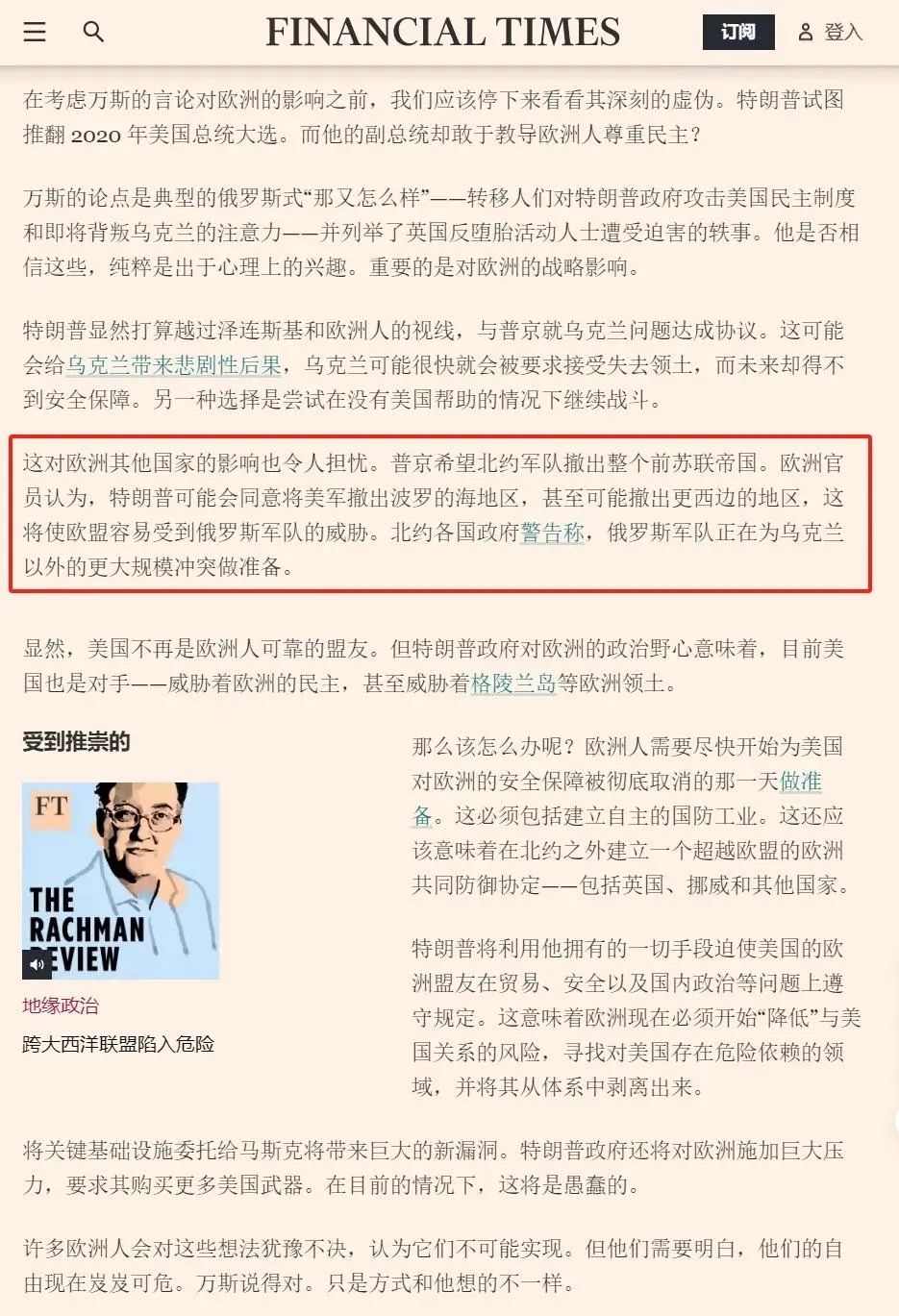 不僅如此,英國《金融時報》指出,美國的撤軍範圍可能不僅限於波羅的海三國,還可能涉及更西部的地區,如波蘭或羅馬尼亞。這意味着,歐洲將不得不自行承擔防務責任,而一直以來依賴北約保護的歐洲國家,如今面臨前所未有的挑戰。
