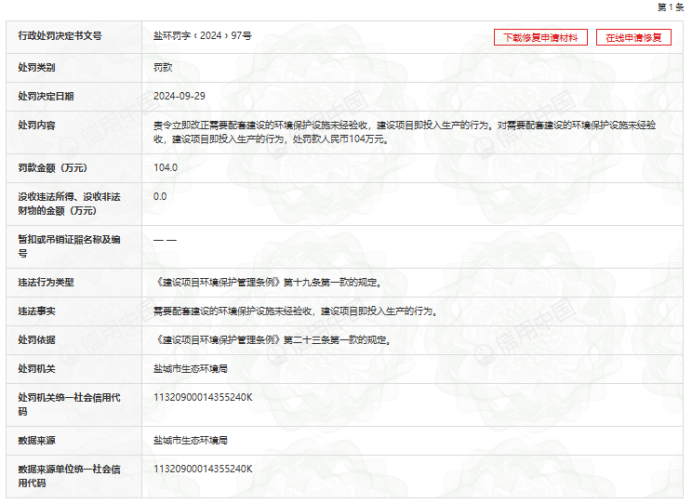 至於東台雙胞胎畜牧有限公司就更厲害了。去年9月份該公司被鹽城市環保部門查處發現,該公司需要配套建設的環境保護設施未經驗收,建設項目就投入了生產,該違法行為被責令改正並處以104萬元的鉅額罰款。