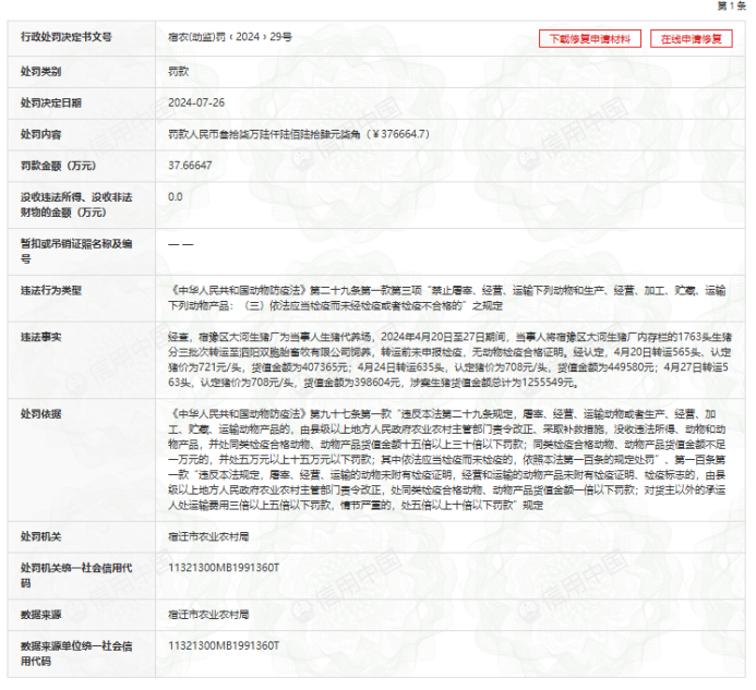 上文提及,今年初因兩萬多頭仔豬未經檢疫重重處罰了清遠雙胞胎豬業有限公司,如果説仔豬還算好的話,那麼去年7月份宿遷市農業農村局的處罰就有點讓人擔心了。該處罰顯示,宿遷雙胞胎豬業有限公司的生豬代養廠,將1700多頭生豬未申報檢疫也未經檢疫合格就轉運了。