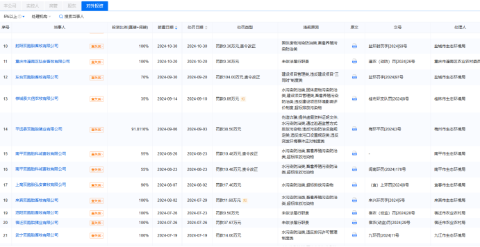 其他還有平遠縣雙胞胎豬業有限公司、南平雙胞胎科誠畜牧有限公司、上高雙胞胎弘安畜牧有限公司、來賓雙胞胎畜牧有限公司、武寧雙胞胎畜牧有限公司等等,因環保違規被罰的金額也不在少數,許多子公司被處罰10多萬元的金額,且部分子公司還存在屢罰屢犯的情形。