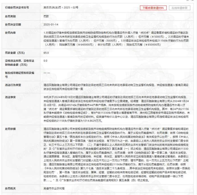 信用中國數據顯示,今年1月14日,英德市農業農村局對雙胞胎集團旗下子公司清遠雙胞胎豬業有限公司開出65萬元的罰單。