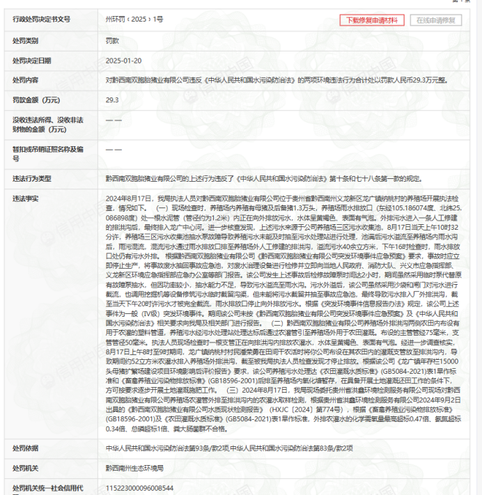 今年1月20日,黔西南雙胞胎豬業有限公司因環境違法行為被黔西南州生態環境局處以29.3萬元的罰款。