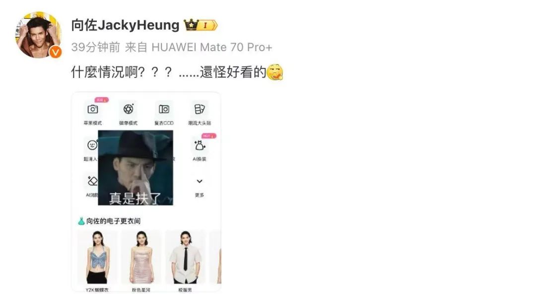 向佐本人也忍不住玩梗,“什麼情況???雖然都還挺美的。”答曰,“佐哥你就説愛不愛吧”。
