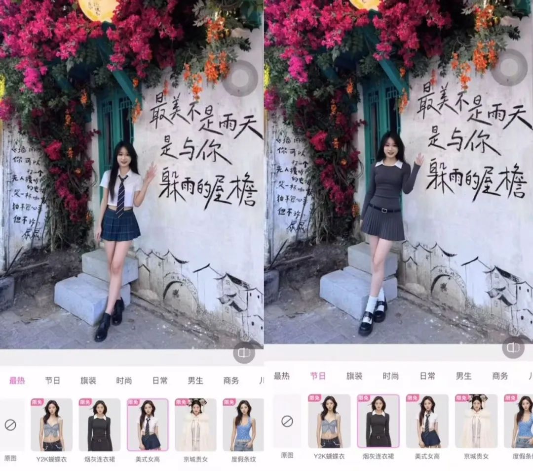 厚重羽絨服的街頭風,搖身一變就成了公園辣妹,海灘邊的“老幹部風”一秒變“沙灘風”,街頭休閒風秒變高冷御姐,無論職場幹練風還是甜美少女風,美顏相機都能“無痛”輕鬆切換,極大豐富了博主們的內容創作空間,這種自定義且個性化的時尚體驗,讓博主們的內容更加多元化,也同時強化了用户的互動與參與感。