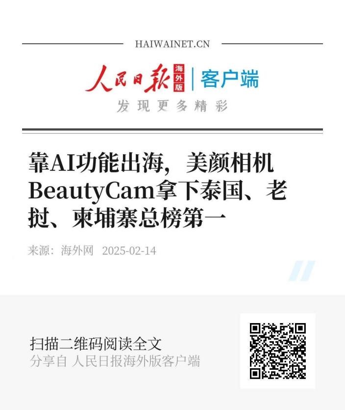 無論是海灘普通短袖穿搭一鍵高適配的辣妹裝、日常照片秒變風格、還是度假風商務風一鍵切換,全球博主們在各大社交媒體上玩得起勁兒,美顏相機BeautyCam也就此成為了全球新晉“流量密碼”。在TikTok爆發式刷屏,成2025年首個影像應用爆款,登頂全球40+國家/地區的下載總榜和攝影分類榜,其中還包含了中、美、日、韓市場。誰懂這個含金量嗎?人民日報等媒體都進行了報道。