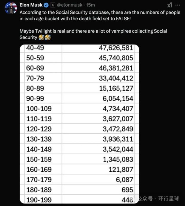馬斯克對SSA的爆料簡單清晰,一是人口數字對不上,二是年齡過於荒謬,幾乎是一刀斃命,引發巨大的轟動效應。