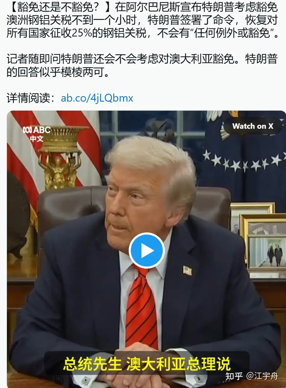 二是鋼鋁最近加徵關税25%這事兒,澳大利亞明明對美國是逆差了,但也受到波及,澳大利亞總理堅稱,川寶會看在順差的面子上豁免澳大利亞,打電話過了,都談好了,但川寶自己面對記者提問依然吞吞吐吐。